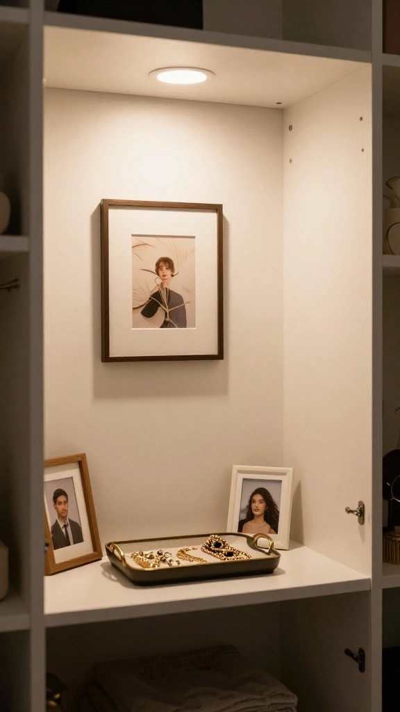 Incorporating decorative displays in your small walk-in wardrobe allows you to showcase your style while maintaining organization. Display items like handbags, hats, or shoes on decorative stands or shelves to create an appealing visual narrative. This not only enhances aesthetics but also makes it easier to access and select pieces.