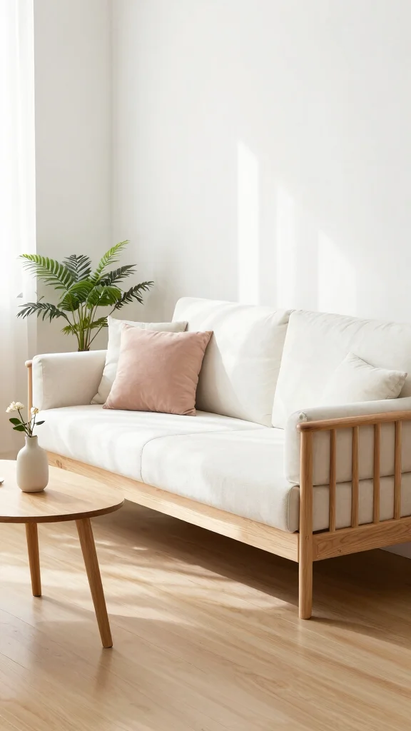To embrace this design, select light wood frames that enhance the airy feel of your space. Soft pastel colors further contribute to a calming atmosphere, making your home a tranquil retreat. Multi-functional designs that prioritize both aesthetics and utility are key to achieving this look.