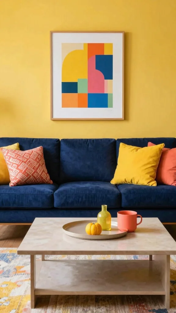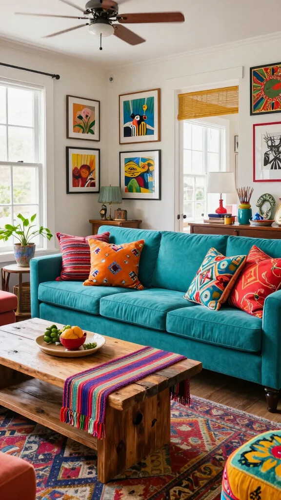 An eclectic living room bursting with vibrant colors and patterns reflects your unique personality. A bold-hued sofa, such as deep teal or rich mustard, can be the centerpiece, surrounded by playful patterned accents. Sourcing eco-friendly textiles from local artisans ensures your decor is both stylish and sustainable. Imagine a space where each piece tells a story, creating a joyful and dynamic atmosphere.