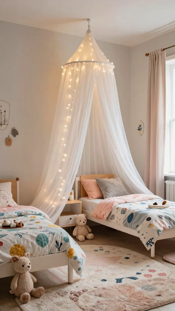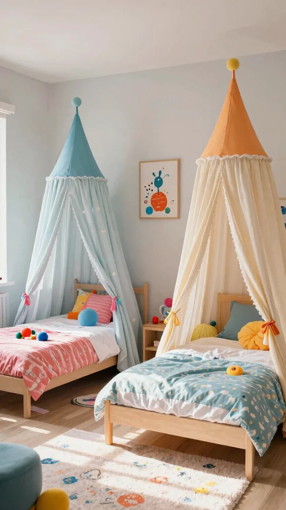 Transforming a bedroom into a magical retreat with twin beds under a shared canopy can ignite a child’s imagination. Draping soft fabric over the beds creates a cozy hideaway that feels both special and inviting. This layout not only adds enchantment but also encourages bonding and playful interactions.