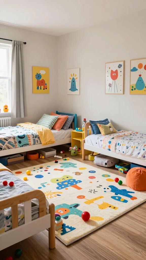 Arranging twin beds around a central play area is a fantastic way to encourage both sleep and playtime in a shared room. This layout provides ample space in the middle for toys, games, or even a cozy mat. It promotes sibling interaction and shared experiences, making the room feel inviting and fun.
