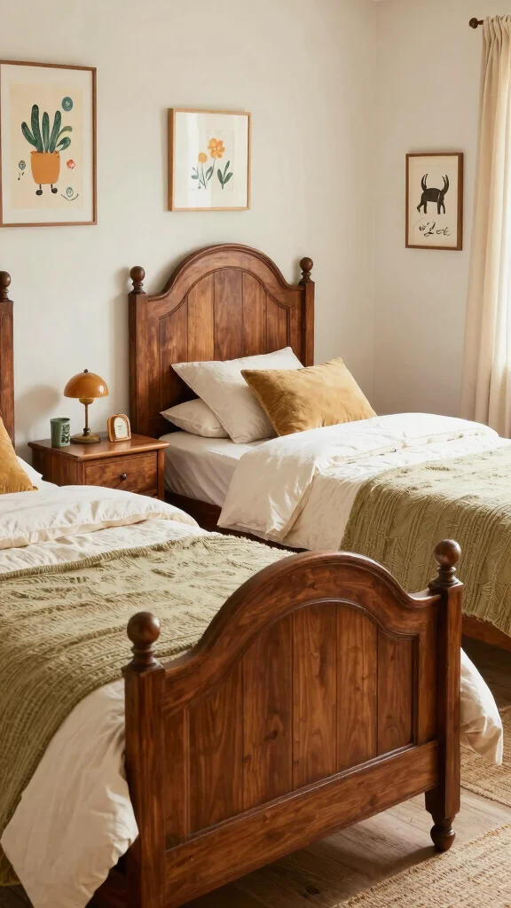 Vintage twin beds add a touch of classic elegance to a shared bedroom, enhanced beautifully by layered bedding for visual depth. Mixing textures and patterns creates a warm, inviting atmosphere. The intricate details of vintage styles can serve as a charming focal point in the room.