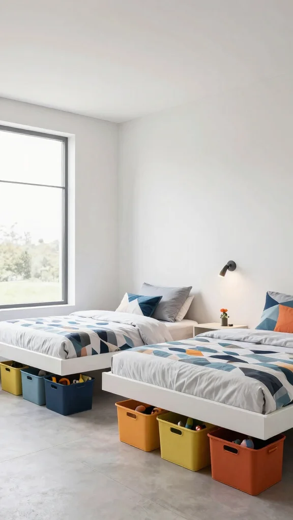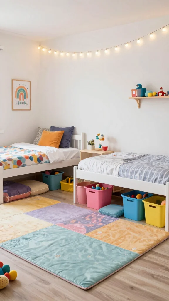 Under-bed play areas aren’t just cute—we save space and spark imagination in twin beds in one room. Toss in soft mats and labeled bins, and twins can claim their own cozy hideaway in seconds—perfect for reading time or imaginative adventures in a shared room.