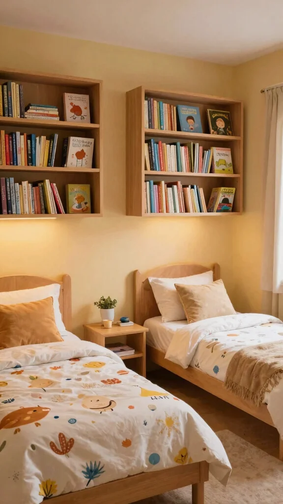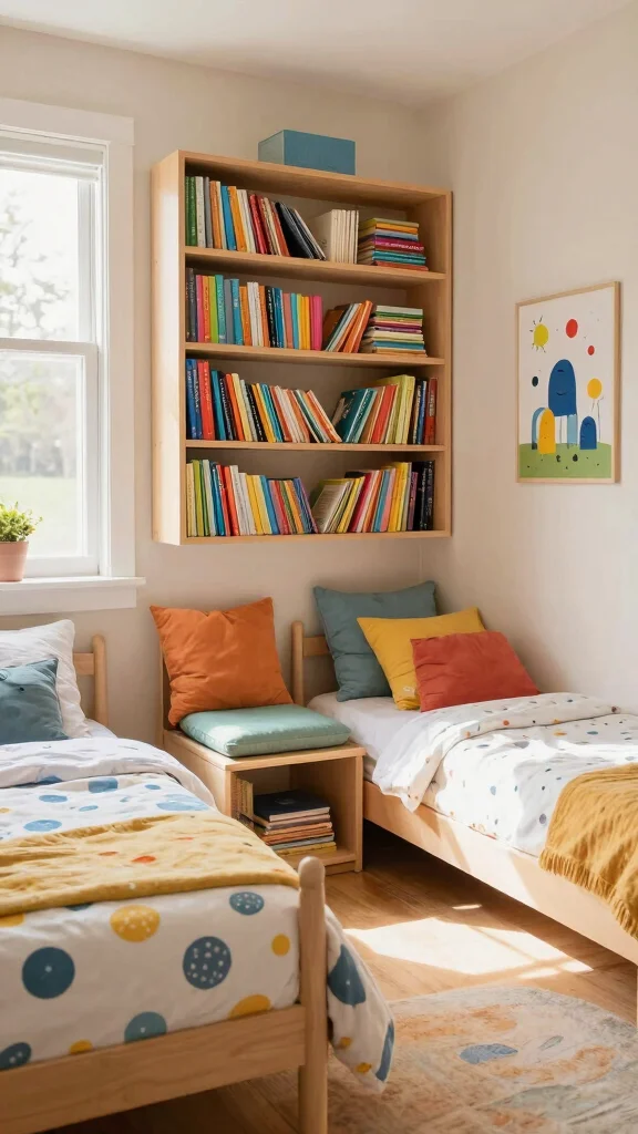 Placing twin beds in a corner with a shared book nook offers a unique and cozy layout. This setup not only saves space but also creates an inviting area perfect for reading and relaxation. By adding shelves or a small bench, siblings can enjoy quiet moments together without losing their closeness.