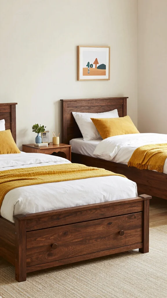 Mission-style twin beds bring a timeless elegance to a shared bedroom while providing built-in storage solutions. Crafted from sturdy wood, these beds offer not only sleeping space but also additional storage beneath, making them a popular choice for shared rooms.