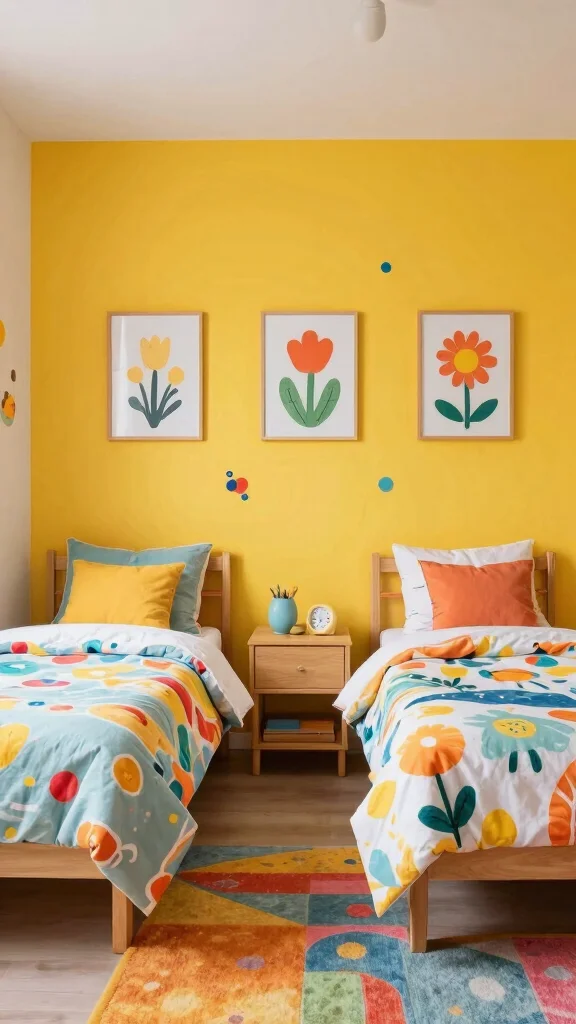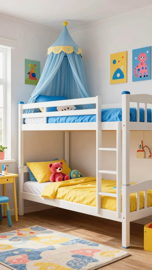 Don’t forget to incorporate playful rugs and wall art that harmonize with the bedding colors, creating a unified look throughout the space. This thoughtful design makes each bed feel distinct yet connected.