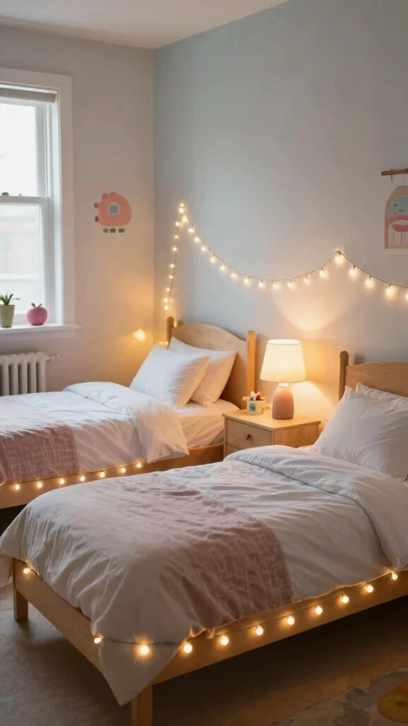 Choose colorful lamps or those with fun shapes to add character to the decor, and string lights can be draped around beds or along walls for a magical touch.