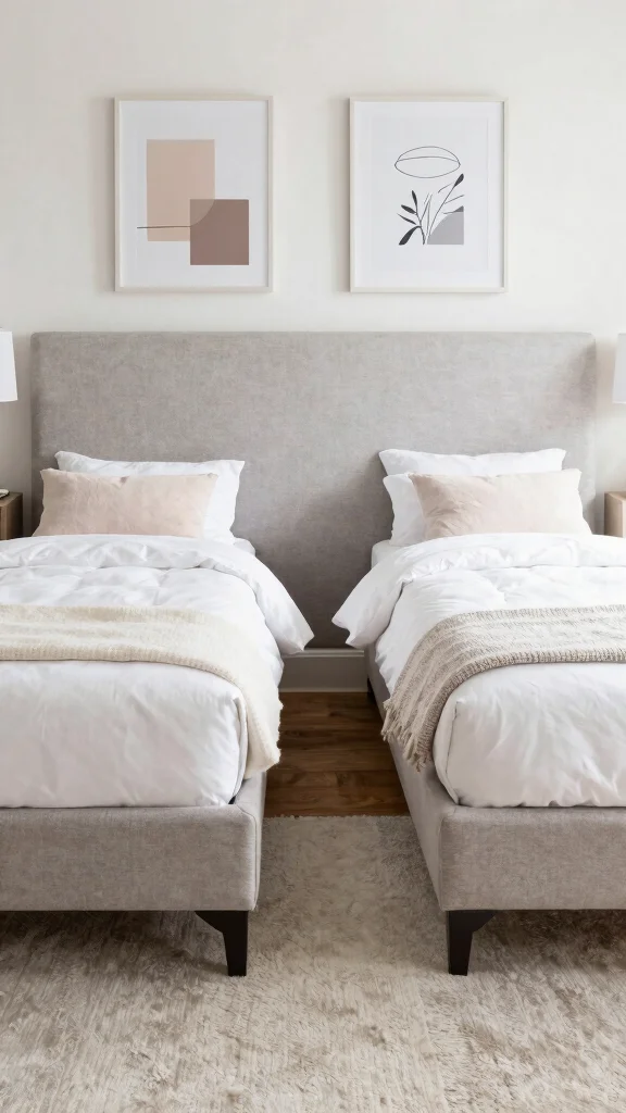 Creating a cohesive look with two twin beds sharing a stylish headboard can elevate the entire room’s design. A large, upholstered headboard serves as a stunning focal point, marrying comfort with elegance and allowing for personalized touches, like removable fabric covers. This design not only unifies the space but also makes it easy to refresh the look over time.