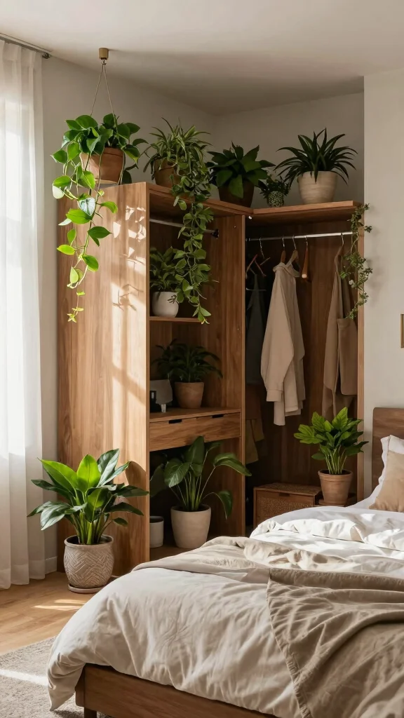 To implement this idea, consider choosing low-maintenance plants that thrive in indoor conditions. Look for stylish pots that complement your existing decor, ensuring a cohesive look. Placing greenery strategically can enhance natural light and create an energizing environment, making your wardrobe a peaceful retreat.