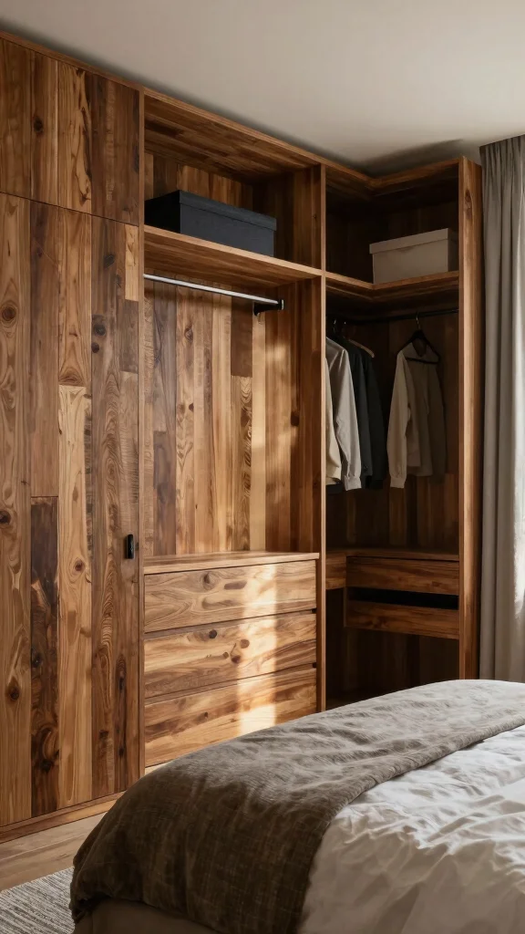 Fun fact: Reclaimed wood behind the bed brings instant warmth and texture. Two to three natural wood tones can make a small walk-in wardrobe feel cozier and more inviting. Practical tip: mix and match wood grains for depth without overwhelming the space.