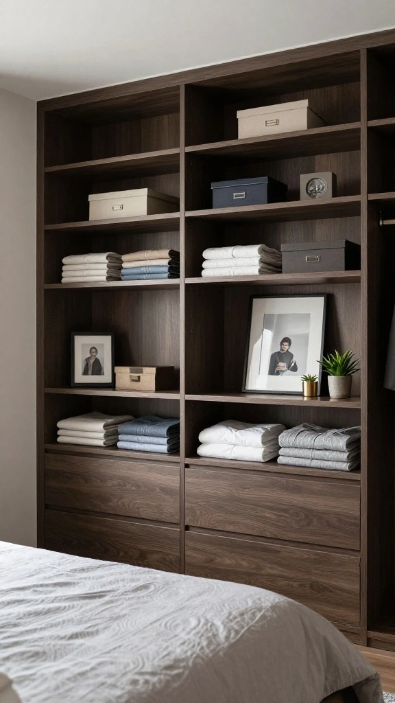 If you appreciate a minimalist design, open shelving could be your perfect solution! This approach allows you to showcase your favorite outfits while maintaining an organized look. By placing your walk-in wardrobe behind the bed, you can creatively display folded garments and accessories, inviting a sense of personal expression into your space. It’s a practical solution that also adds a unique character to your bedroom.