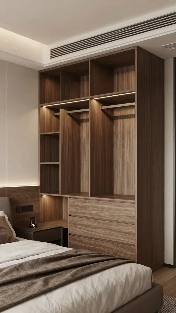 Craft a wardrobe that integrates beautifully with your bedroom design. A built-in wardrobe behind the bed offers a sophisticated look while maximizing available space. By including integrated lighting, you can enhance visibility and create a visually appealing storage solution. This design not only appears sleek but also provides seamless functionality for your everyday needs.